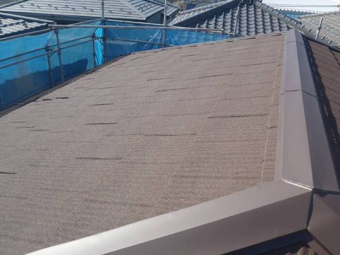 屋根の縁に笠木を取り付けて、雨水の浸入を防ぎ、耐久性を向上させます。